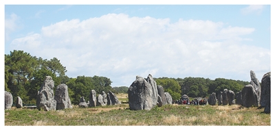 这些大型石头遗址被赋予了“巨石林”、“立石”、“土墩”等名称,显示了古人利用石头结构作为媒介组织空间和表达信仰的惊人能力。卡纳克镇的巨型石林(见图,尚开元摄)是该遗址中最具代表性的:3000多块石头沿着地势整齐排列,蜿蜒在马鲁尔公里外,如此宏大、规则、具有象征意义的结构引发了人们对史前世界的诸多猜测。
