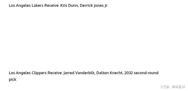 虽然同在一座城市,但湖人队和快船队自本赛季开始以来整体表现截然不同。紫金湖人队进步很大,已经成为除雷霆队和掘金队之外的西部最强球队。快船队未能复苏,目前排名西部第二。何况明年的首轮选秀权还在雷霆手里。一不小心,就会给别人很高的评价。因此,媒体FW建议洛杉矶二人组可能寻求讨论交易。在节省成本方面,湖人正在追求邓恩和小德里克琼斯两名工程师。快船吞下了负资产,也就是范德比尔特的溢价合同,并得到了克内特和一个2032年的二轮选秀权作为补偿。双方目标明确 湖人队首发五虎进攻能力较强,需要加强防守。这边走,阵容在过渡期间会有更大的调整空间,包括决胜时刻。快船队的两名球员正好符合这个要求。本赛季邓恩场均贡献7分2.9篮板2.8助攻。数据看起来并不令人印象深刻。但在场均近26分钟的出场时间里,邓恩可以送出1.5次抢断,而且他的投篮也不断进步。本赛季,他拥有35%的三分命中率,并成为了首发。即使湖人队很聪明,但后者的年龄和伤病显然需要替补,而邓恩可能是一个理想的替代者。小德里克琼斯与快船队的合同确实有效,但由于伤病,他在此期间休息了一段时间。这对于快船来说是非常致命的打击。小德里克琼斯在场上精力充沛,尤其是作为快船队的领袖,他是体系中的重要组成部分。说起来,小德里克琼斯和东契奇曾有过短暂的合作,两人看起来默契十足纽约。在巨星身边,小德里克琼斯不仅能出色得分,还能通过可靠的防守有效分担他们的压力。快船队逐渐着眼于未来。用邓恩和小德里克琼斯换来这么多财产可能不太现实。那么获得范德比尔特合同并引进一些新鲜血液是一个可行的解决方案。克内特上赛季表现确实不错,尽管缺乏亮点,但他的新秀奖金合同还有两年,还有一个二轮选秀权作为奖金,快船必须接受。